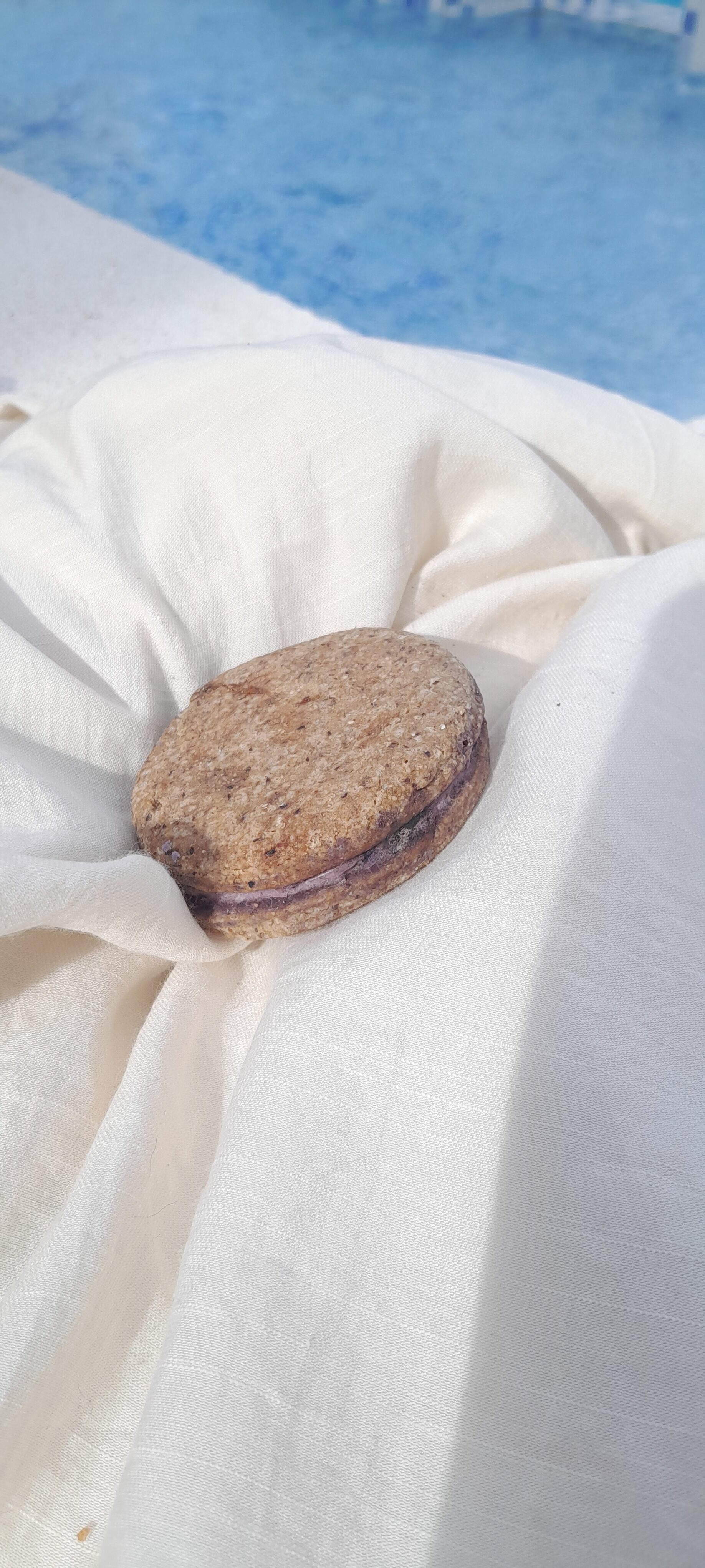 Alfajor de castaña y sarraceno, crema de alubias y arándanos con naranja. Sin gluten. plant based, low carb. Peso aprox 60 gr