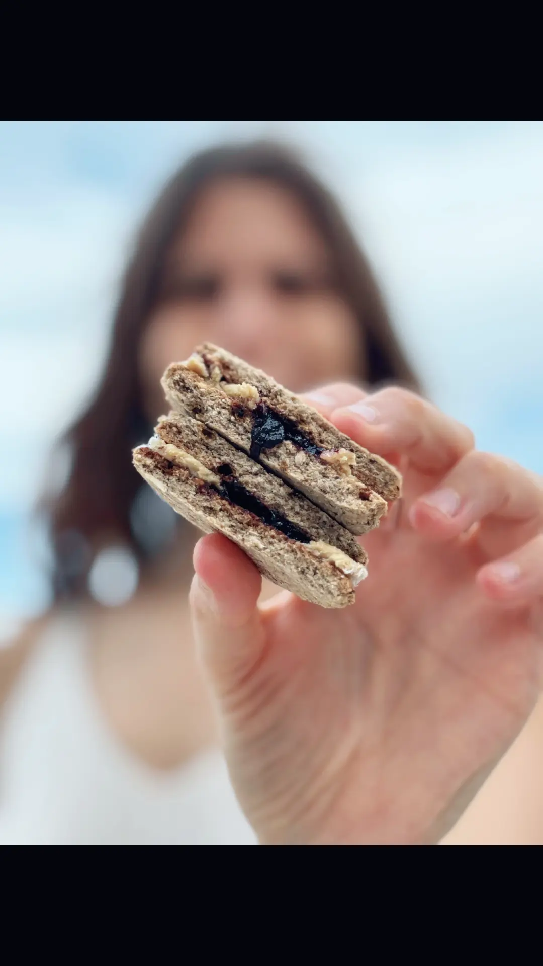 Alfajor a base de harina de castañas, sarraceno y coco relleno de mantequilla de  maní mas mas corazón de jalea de arandanos